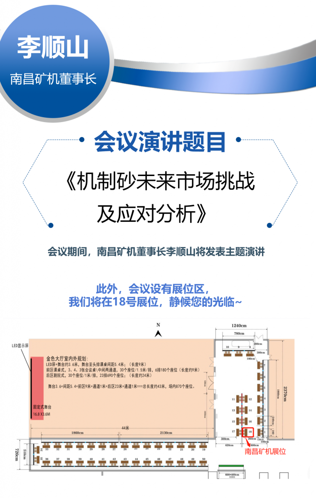 南昌礦機董事長李順山將出席會議,發(fā)表以《機制砂未來市場挑戰(zhàn)及應(yīng)對分析》為題的主題演講。會議設(shè)立集中展示區(qū),南昌礦機將在18號展位進行企業(yè)展示,靜候您的光臨。