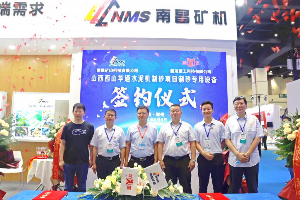 ? ? 9號上午,南昌礦機展位舉辦了山西西山華通水泥機制砂項目制砂專用設備簽約儀式,南昌礦機總裁龔友良與山東圓友重工科技有限公司(下稱“圓友重工”)副總經理李冠堅進行了簽約,標志著展位上展出的HFS液壓高頻篩和VSD雙腔立軸破碎成功售出。